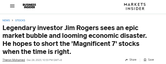 美国传奇投资者吉姆·罗杰斯(Jim Rogers)警告,2024年或出现巨大的市场泡沫和经济灾难。美国商业内幕(Business Insider)网站12月28日报道称,罗杰斯预计资产价格将暴跌,经济灾难将来临,他计划在时机成熟时通过做空特斯拉(Tesla)和英伟达(Nvidia)等股市宠儿来获利。