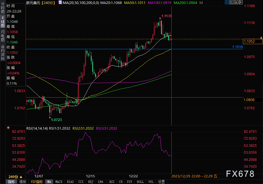 周五(12月29日),美盘时段,欧元/美元窄幅震荡,现报1.1056,跌幅0.04%。欧元主力报1.1091,跌幅0.08%。欧元周五小幅走低,主要是受到美元在节前时段温和反弹影响。