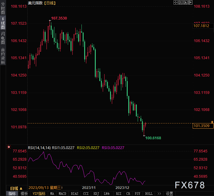 周五(12月29日),美盘时段,美元指数窄幅震荡,现报101.3110/11,涨幅0.07%,美元指数现已跌至5个月低点。