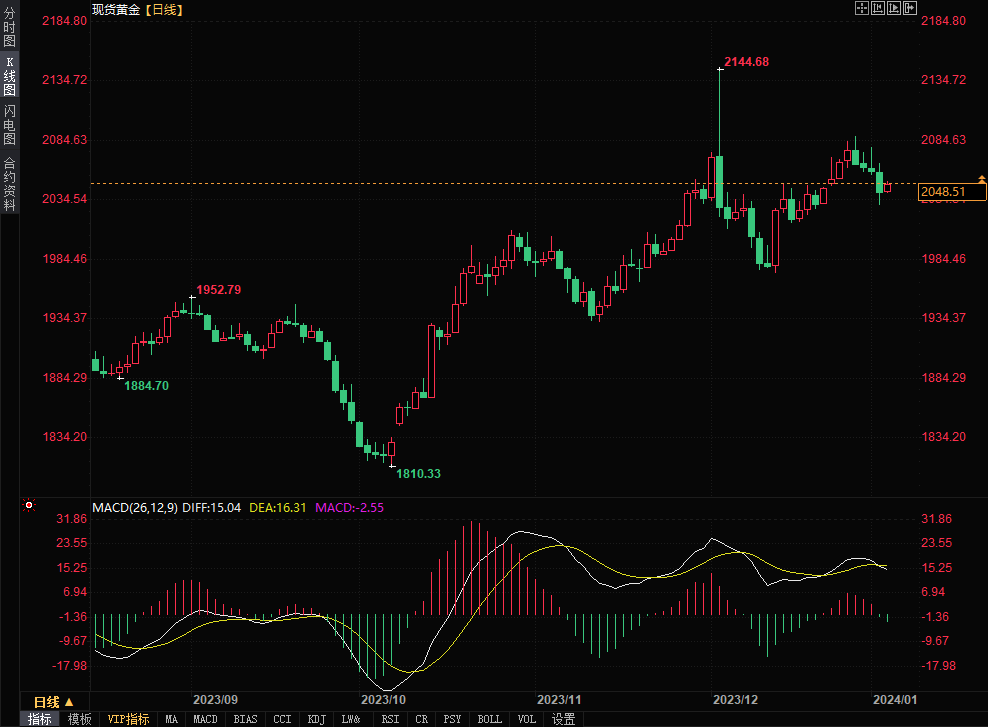 现货黄金价格上涨0.44%,至每盎司2050.13美元。尽管如此,金价在周三曾触及12月21日以来的最低水平。黄金价格的波动反映出市场对于全球经济形势和货币政策的不确定性。