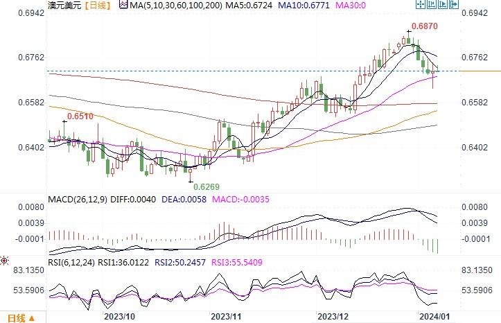 上周五(1月5日),在美国公布好坏参半的经济数据后,澳元/美元较为动荡,最低曾探至0.6639,收盘阶段则有所回升,最后收盘于0.6713水平。由于美国劳动力市场数据依然强劲,导致降息时点以及降息的幅度定价预期都略有改变。美国达拉斯联邦储备银行总裁洛根周六警告称,美国联邦储备理事会可能需要恢复上调短期政策利率,以防止近期长期债券收益率下降重新引发通胀。洛根的言论,表明美联储仍在试图纠正市场对于美联储今年将大幅降息的预期。利率期货对于美元3月份降息预期的概率也有所降低。为此,澳元/美元的走势也因此受压从年内高点出现下滑的走势。但从4小时级别图上来观察,澳元兑美元在0.6630受到较强硬的支撑,走势似乎也进入了超卖回补的状态。目前上方的初步阻力在0.6728附近,进一步阻力在0.6770。下方初步的支撑在0.6680,进一步支撑在0.6630。
