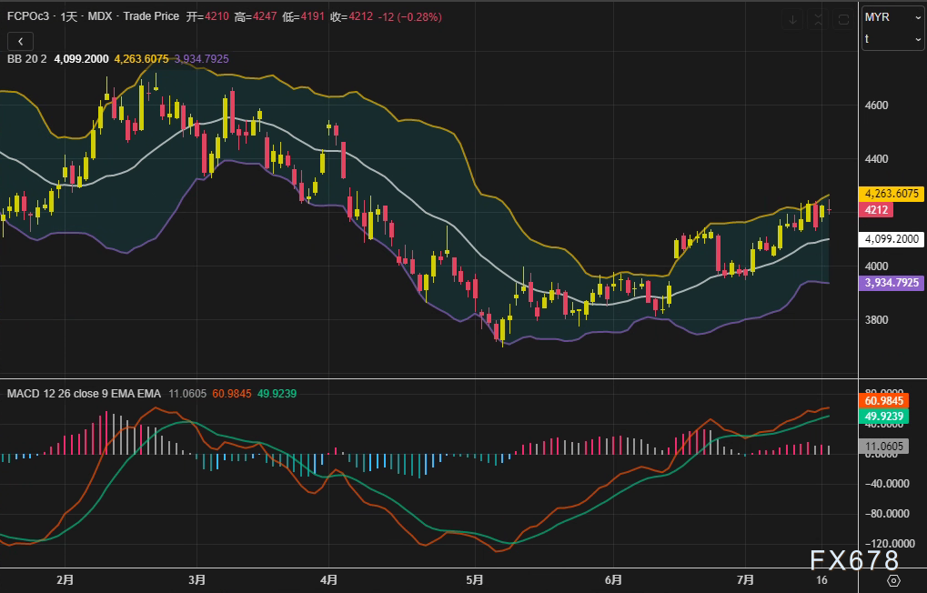 周四(7月17日),马来西亚衍生品交易所(BMD)棕榈油主力合约FCPOc3收于4212林吉特/吨,日内下跌12林吉特(0.28%),技术面显示布林带中轨位于4099点,MACD柱状线持续收窄,短期动能有所减弱。市场在7月上半月出口数据不及预期的打压下回吐前一日涨幅,尽管连盘棕榈油及美豆油走强提供一定支撑。