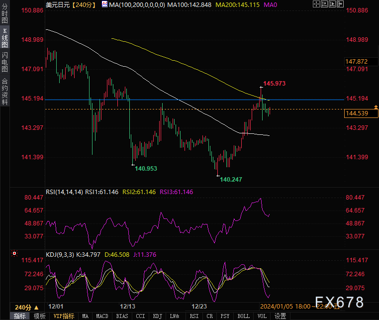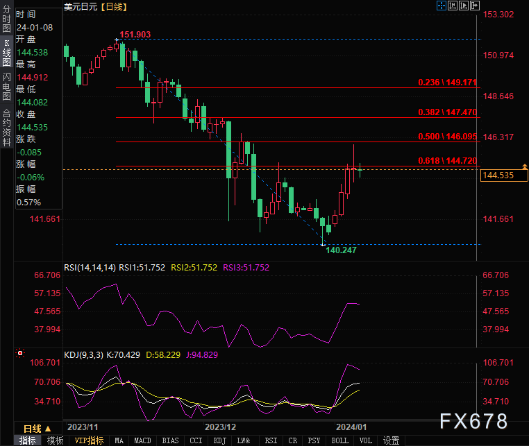 周一(1月8日),美盘时段,美元兑日元窄幅震荡,盘中报144.487,跌幅0.09%。日元主力报0.7000,涨幅0.14%。