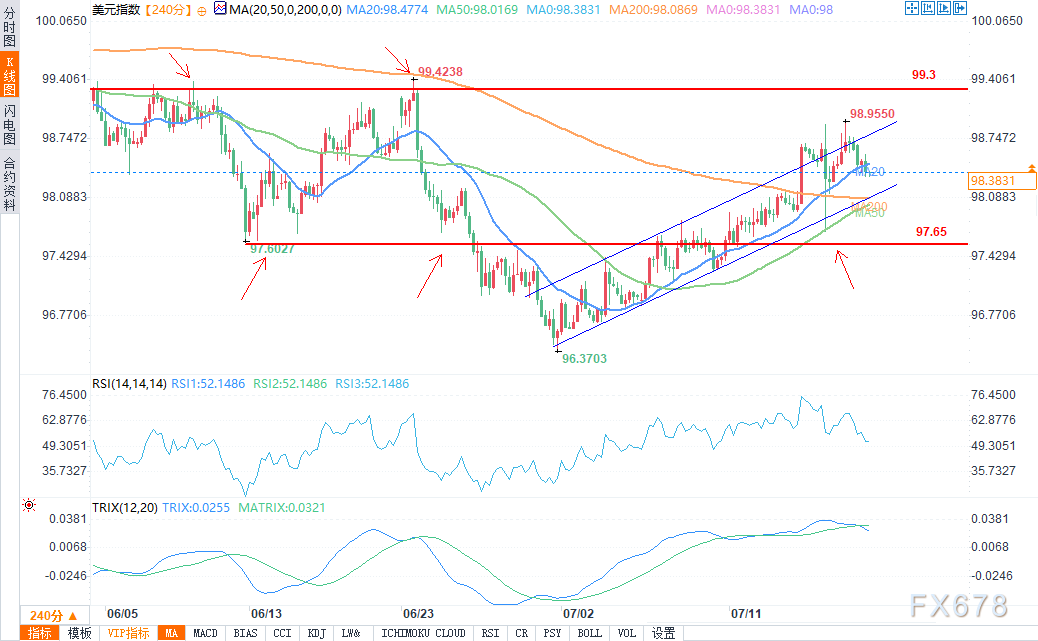 周五(7月18日),分时图上美元指数整体呈现出先大幅下跌,随后震荡调整的态势。价格从接近98.7198的高位开始回落,最低下探至约98.3209附近,目前美元指数处于短线调整阶段。