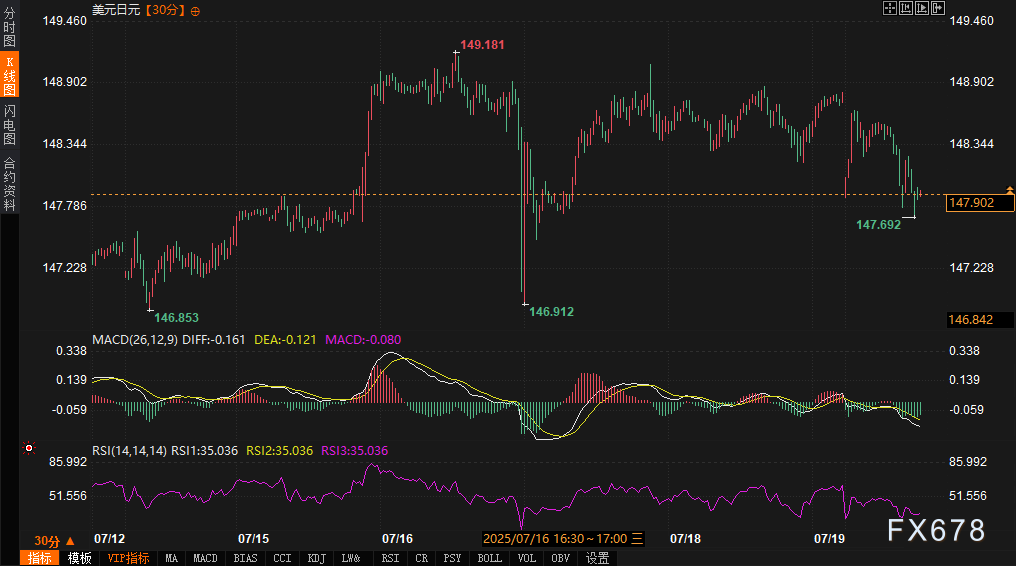 周一(7月21日),周末结束的日本参议院选举完成计票石破茂的自明党再次失利。美日午后跳水0.5%,最低147.75,现守148。市场USD/JPY的上涨表现出了“预期兑现式驱动”:早盘冲高回落,最高达到148.66,之交易时段震荡走低,回顾7月3日-20日的涨势(144.9→149.2)市场提前押注执政联盟败选,而7月21日的回落则因“买预期卖事实”及技术超买修正。