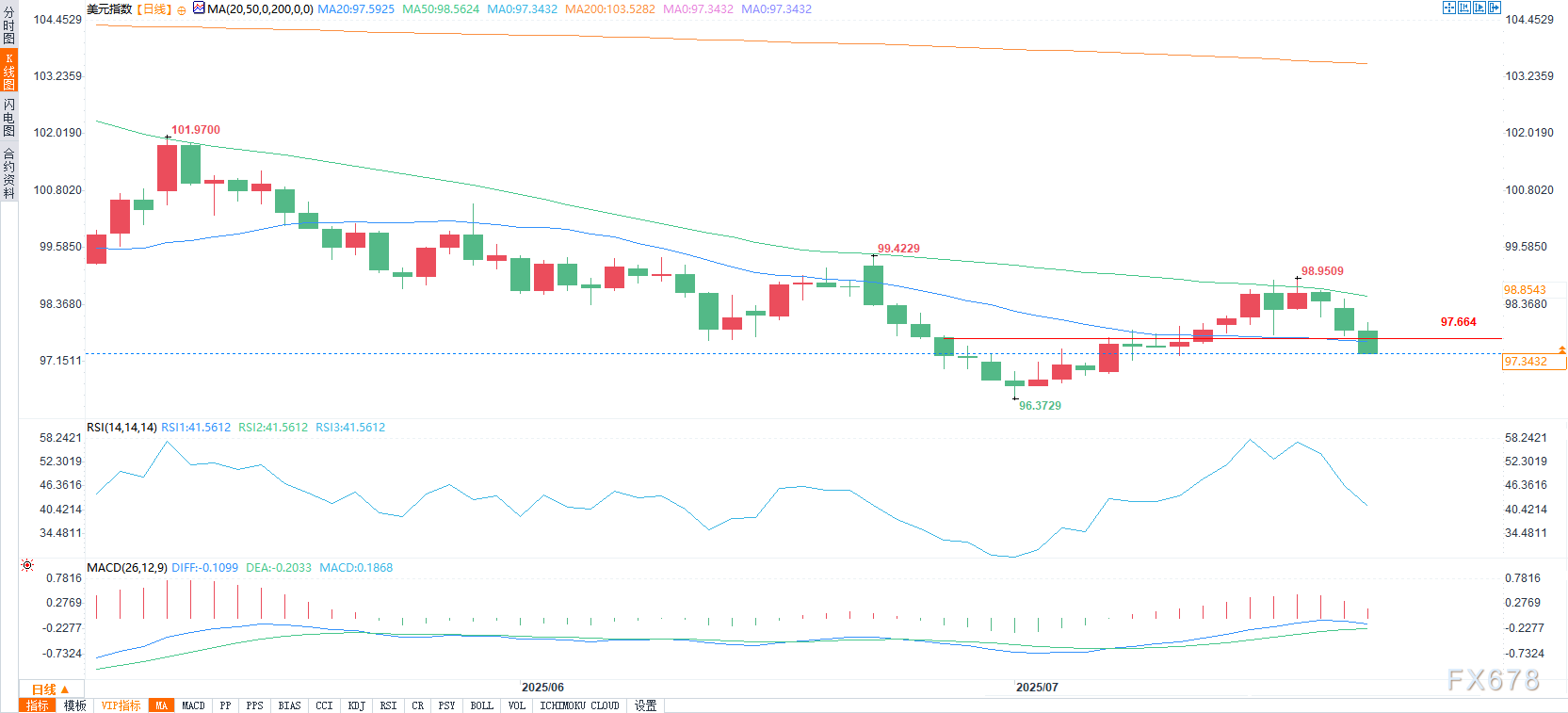 周二(7月22日),美元指数未能守住上周98.95的高点(该点位曾短暂突破阻力位,但随后抛压回归),日内小幅回落。