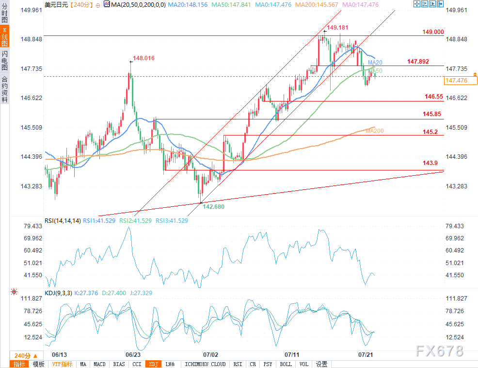 受周日日本参议院选举结果影响,在7月21日亚洲交易时段,汇价向下跳空跌破自7月1日低点形成的小型上升通道支撑位,随后回测此前小型上升通道支撑位转化的回撤阻力,接着在美国交易时段小幅下跌0.9%,盘中低点触及147.08。