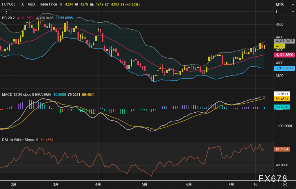 周二(7月22日),马来西亚衍生品交易所(BMD)棕榈油主力合约FCPOc3结束日内波动,最终收于4263林吉特/吨,较前一交易日上涨38林吉特(0.9%),收复周一2.1%的部分跌幅。技术指标显示,当前价格位于布林通道中轨(4121林吉特)与上轨(4328林吉特)之间,MACD柱状线收窄至10.6,RSI(14)报61.16,市场短期呈现偏强震荡格局。
