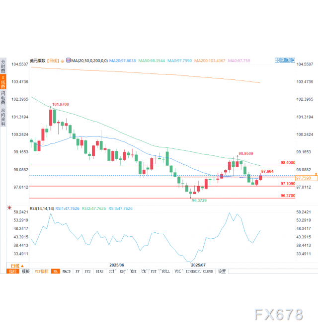 技术面买家正将目光投向50日均线98.400,视其为下一个阻力位。预计该水平将出现初步抛售压力,但一旦决定性突破,涨幅可能延伸至7月17日高点98.95。
