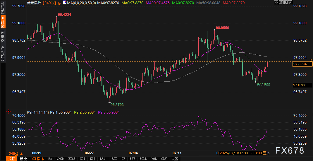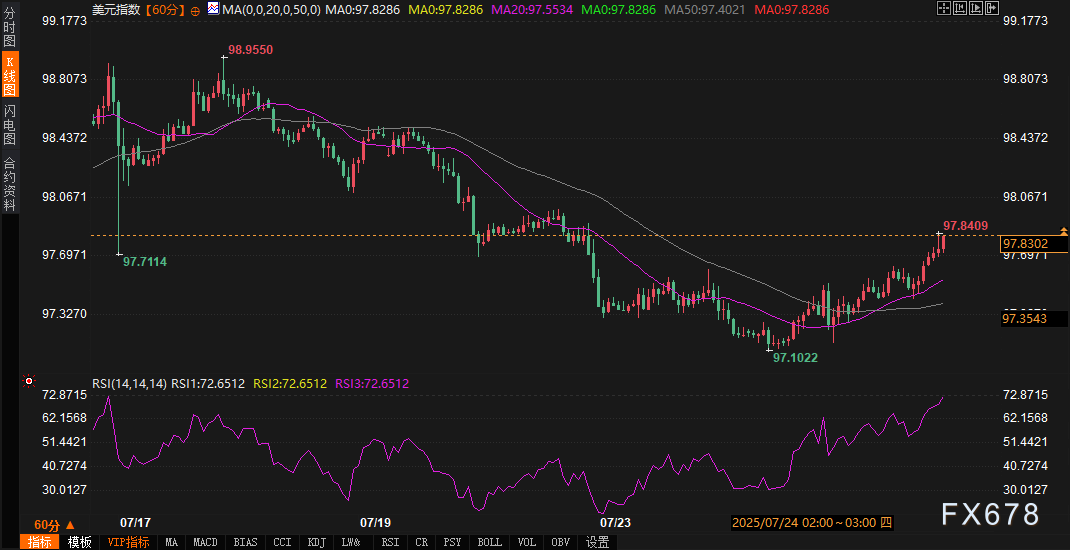 周五(07月25日) ,外汇市场呈现典型的震荡修复行情。截至当前,美元指数日内微涨0.31%,但周线级别仍承压于98整数关口。市场焦点正从美联储政策预期转向美国经济数据质量引发的信任危机,这一因素通过短期情绪传导与中期趋势重构,正在多时间框架上形成复杂的技术博弈。