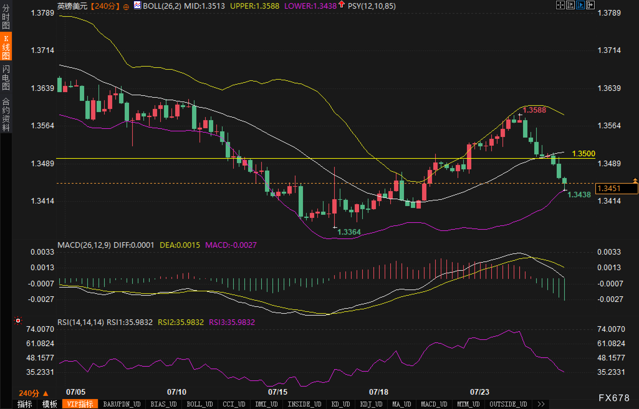 周五(7月25日),英镑/美元延续弱势表现,美市盘前在1.3450附近震荡整理。汇价受到多重基本面因素拖累,呈现明显的调整态势。市场对美联储货币政策预期的变化以及英国经济数据的疲软表现,共同推动了汇价的下行。