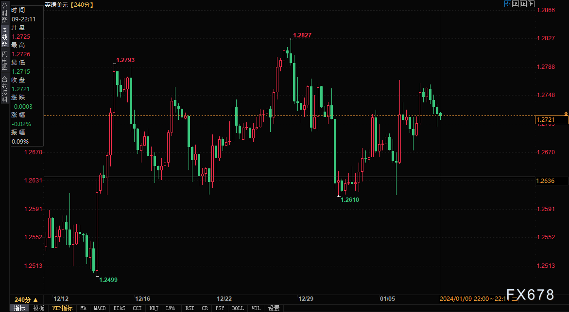 周二(1月9日),美盘时段,英镑兑美元走软,盘中报1.2724,跌幅0.18%;英镑主力报1.2730,跌0.27%。
