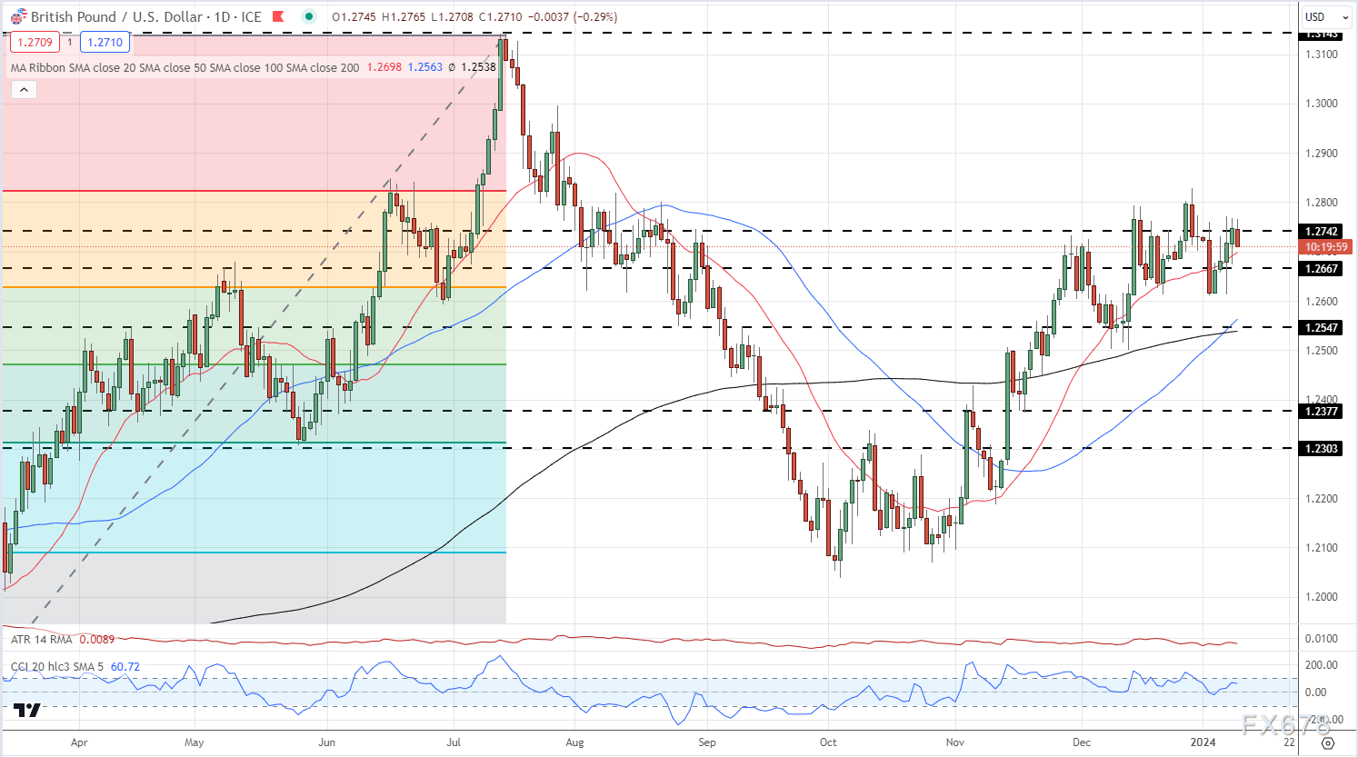 从技术上来看,英镑/美元虽然重回到1.2700上方,但难以守住昨日的涨幅。在1.2667和1.2615附近的一系列前期低点成为焦点之前,20天简单移动平均线(目前位于1.2698)会提供短暂支撑。如果行情向好,上破1.2770-1.2775区域,下一阻力为12月28日高点1.2828。