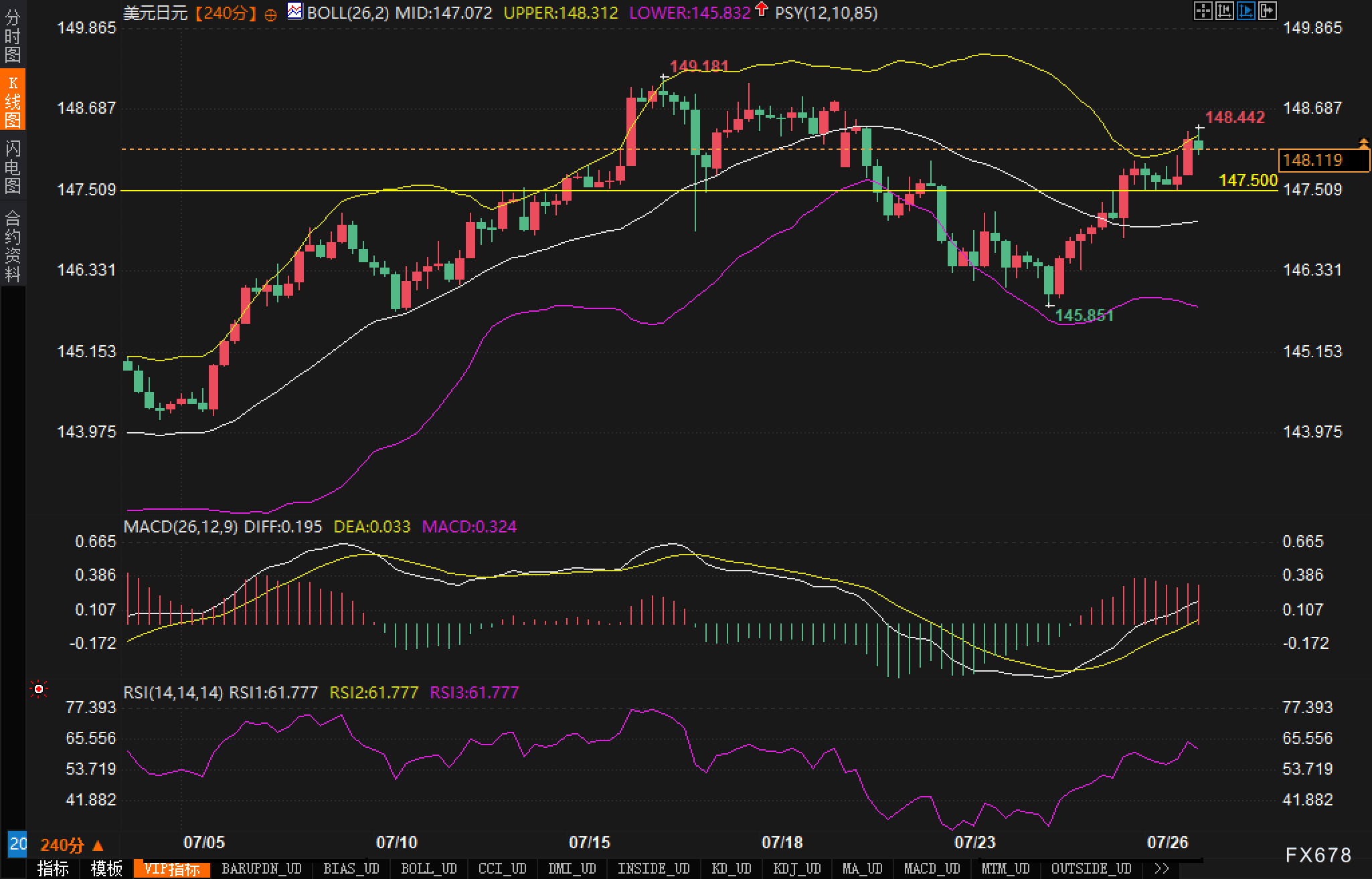 周一(7月28日)美市盘前,美元兑日元震荡走高,汇价交投于148.10一线附近,逼近布林带上轨压力位,技术面呈现阶段性反弹格局。