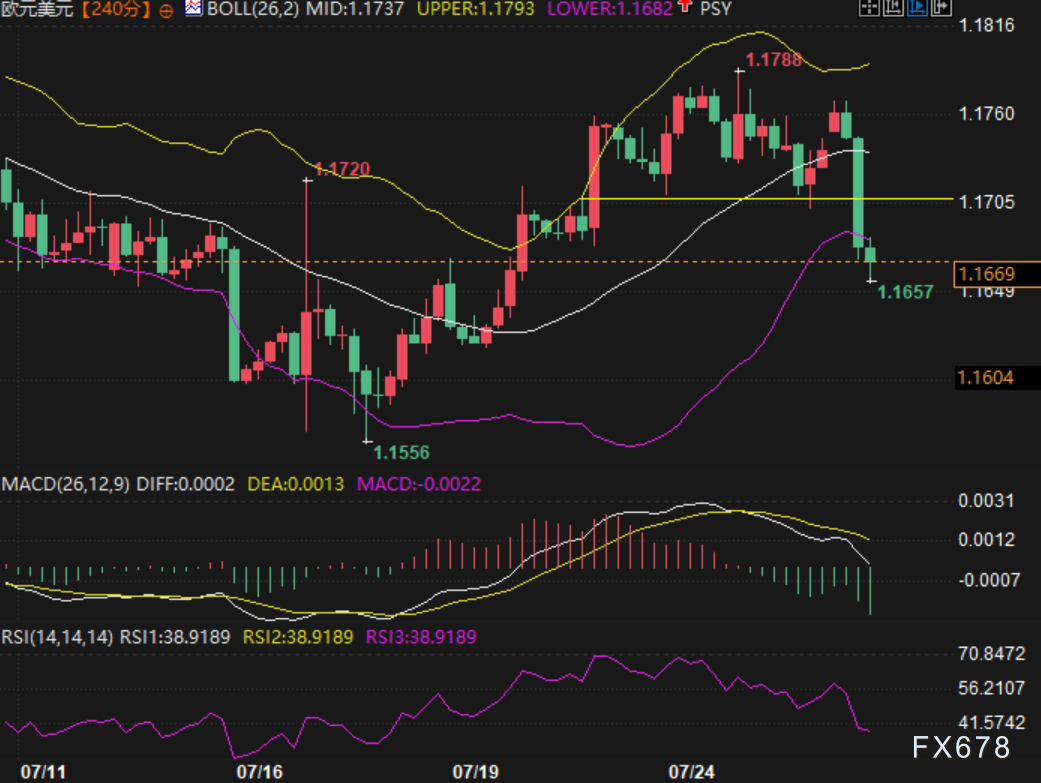 周一(7月28日),欧元兑美元汇价短暂上冲至1.1750上方,随后急剧回落,最低触及1.1657水平,日内振幅显著扩大。欧盟与美国之间达成了新的贸易协议,并宣布对欧产品征收统一15%的关税,并伴随欧方对美高额投资承诺。同时,美元则因耐用品订单及劳动力数据表现优于预期,获得持续支撑,进一步压制欧元反弹空间。
