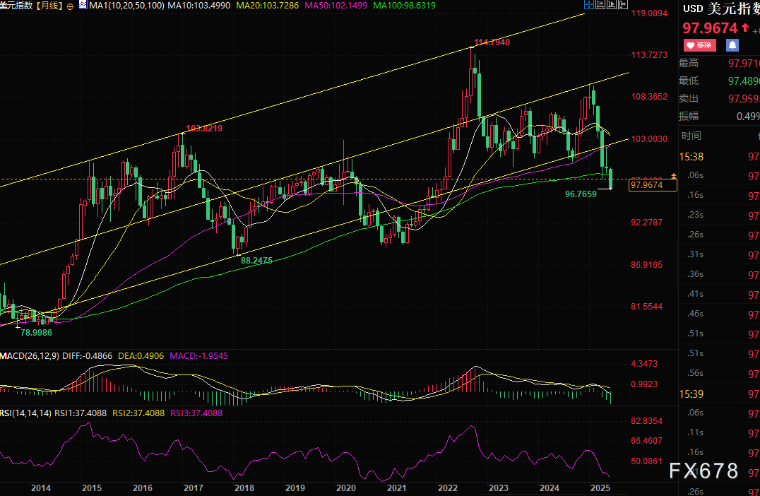 当前美国财政部赤字的年利息成本已突破1.2万亿美元,这一数字不仅是财政失衡的缩影,更是政策困境的集中体现。利率高位运行与债务规模膨胀的叠加效应,未来政府若不能有效控制赤字、修复财政可持续性,利息成本可能进一步侵蚀民生支出和经济增长潜力,最终威胁美元信用与全球经济稳定。借鉴2008年金融危机后,美联储将利率降至零并维持7年,叠加量化宽松(QE),虽然联邦债务从10万亿美元增至20万亿美元,但利息支出占GDP比重从1.7%降至1.3%,美元指数可能会出现随着降息、经济结构调整的阵痛期,或中长期保持下跌趋势。注:美元指数月线在抵抗微弱情况下跌破上升通道下轨道。