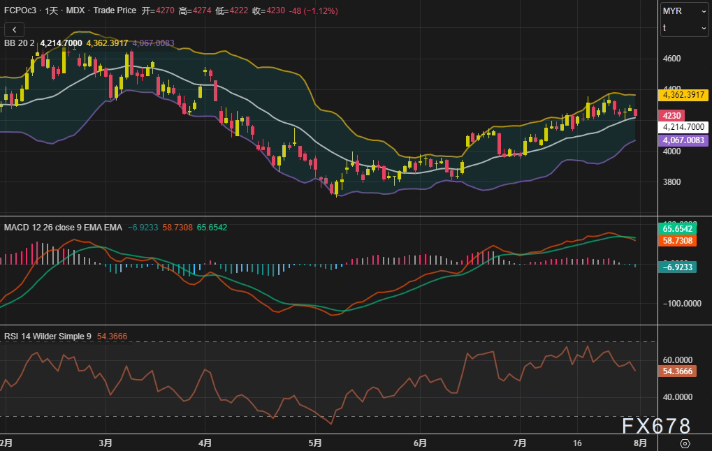 周四(7月31日),马来西亚衍生品交易所(BMD)棕榈油期货结束连续两日涨势,主力10月合约FCPOc3收报4230林吉特/吨,单日跌幅1.12%。技术指标显示,价格跌破布林带中轨(4215林吉特),MACD柱状图负向扩张,RSI中性区间徘徊,短期动能偏弱。市场压力主要来自三方面:竞争油脂价格走低、产地季节性增产预期强化,以及出口数据持续疲软。
