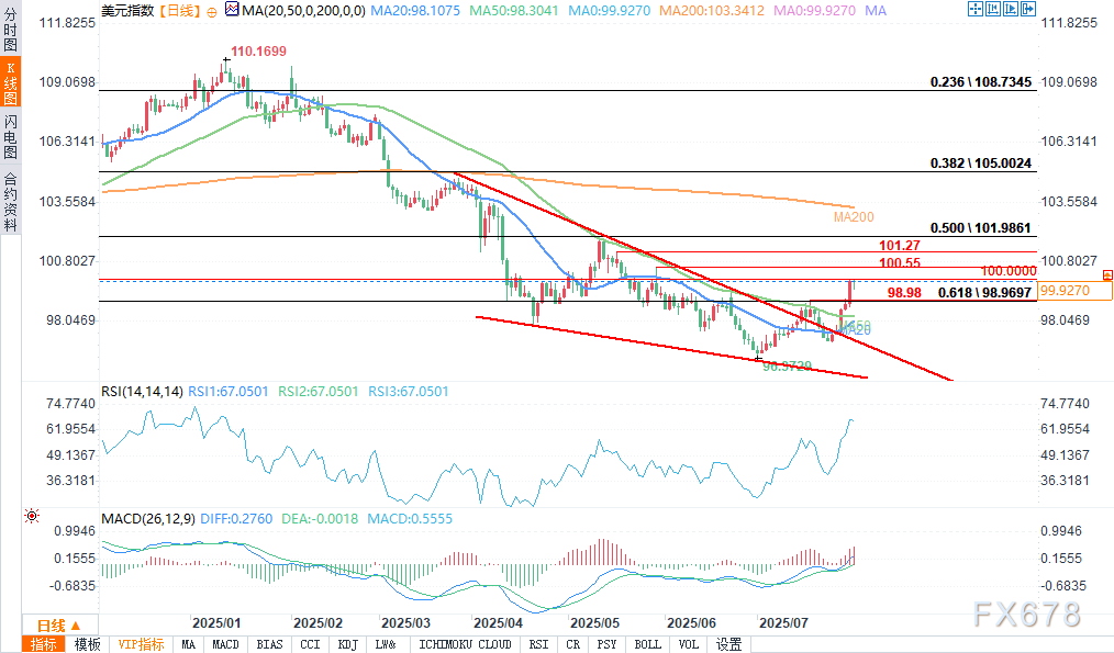 周四(7月31日)美元触及两个月高位,美元指数(DXY)稳守99.50上方,逼近100.00心理关口,过去五日累计上涨近3%,有望实现今年首个正收益月度表现。