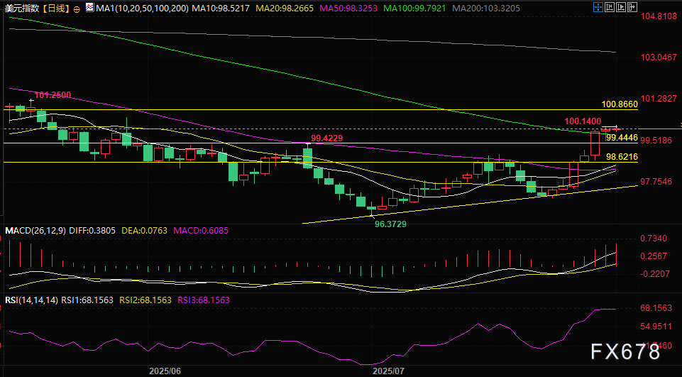 周五(8月1日)亚洲时段美元指数盘中最高涨至100.14创下5月29日以来新高。