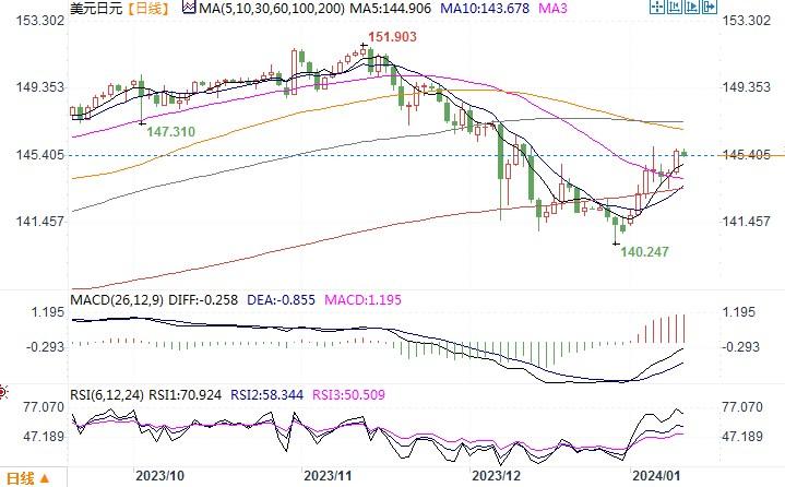 周三(1月10日),美元兑各非美货币走势不一,兑欧元略下跌,而兑日元则上涨0.84%,报145.73。这是因为周初以来日本连续公布的经济数据不佳,其中周三公布的数据显示,11月日本工人实际薪资连续第20个月萎缩。此前周二的数据显示,随着成本推动的价格压力继续缓解,日本首都核心通胀在12月连续第二个月放缓。日本本周疲软的经济数据进一步降低日本央行本月将利率上调至正值的可能性。而美国方面,由于就业数据强劲,市场押注3月份降息的预期似乎有所减弱。为此,美元指数进入新年以来较强顽地盘整于近五个月来低位的上方,兑日元则出现较为明显的空头回补性上升走势。目前市场聚焦周四美国将要公布的12月份通胀数据(CPI),以寻找有关美联储可能何时开始降息的新线索。日线图上,美元/日元再度逼近上周的高点146.00,若突破,前进的目标将瞄向148附近。若继续遇阻,则有产生双顶之疑,从而转而恢复下行的态势。一切须等待周四晚间美国CPI通胀数据揭晓后方可明了。