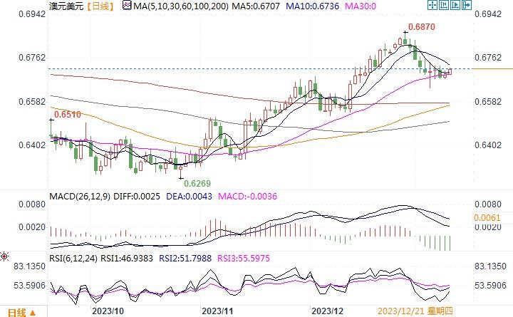 周三(1月10日),澳元兑美元企稳略升0.1%,报0.6699。隔夜市场上澳元/美元的微幅回升,主要拜兑日元交叉盘日元呈弱的间接提振所致。澳洲统计局周三公布的数据显示,11月消费者物价指数(CPI)较上年同期上升4.3%,创近两年低点,与10月份的4.9%和9月份的5.6%相比明显放缓。基数效应意味着12月CPI同比升幅可能朝3.5%回落,更接近澳洲央行2-3%的目标区间。核心通胀指标也大幅下降,足以表明整个第四季度的通胀率将低于澳洲央行自己的预测,并降低了进一步收紧政策的紧迫性。第四季通胀数据将于1月31日公布,澳洲央行将在2月6日召开政策会议。目前众多机构预计澳洲央行近期将继续按兵不动,然后在8月份启动宽松周期。市场几乎已经完全排除了将4.35%的隔夜拆款利率进一步上调的风险,并暗示5月首次降息的可能性约为40%,6月降息的可能性为72%。而如果周四美国12月份通胀数据(CPI)显示增长仍然强劲,那么对于美元3月份将会降息的预期更会进一步降低。如此一来,澳元/美元恐将陷入阶段性的回落行情之中。相反,则澳元/美元有望企稳回升。日线图上,澳元?美元仍处在布林带通道中轨线之下,下行风险仍未得以有效解除。目前,澳元/美元支撑位在10-12月涨势的38.2%回档位0.6641,阻力位在10日均线0.6734,若能突破将有望扭转跌势转而向上行。