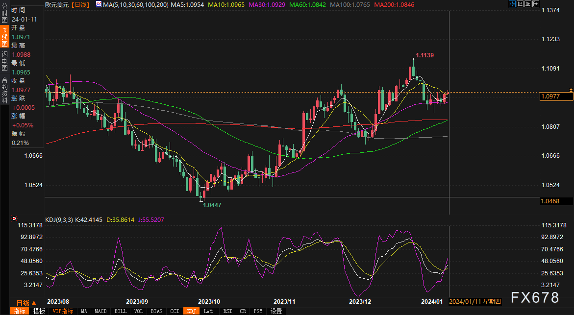 北京时间周四(1月11日)16:39,欧元兑美元交投于1.0977/78,涨幅0.05%;欧元主力交投于1.006/07,涨幅0.05%。