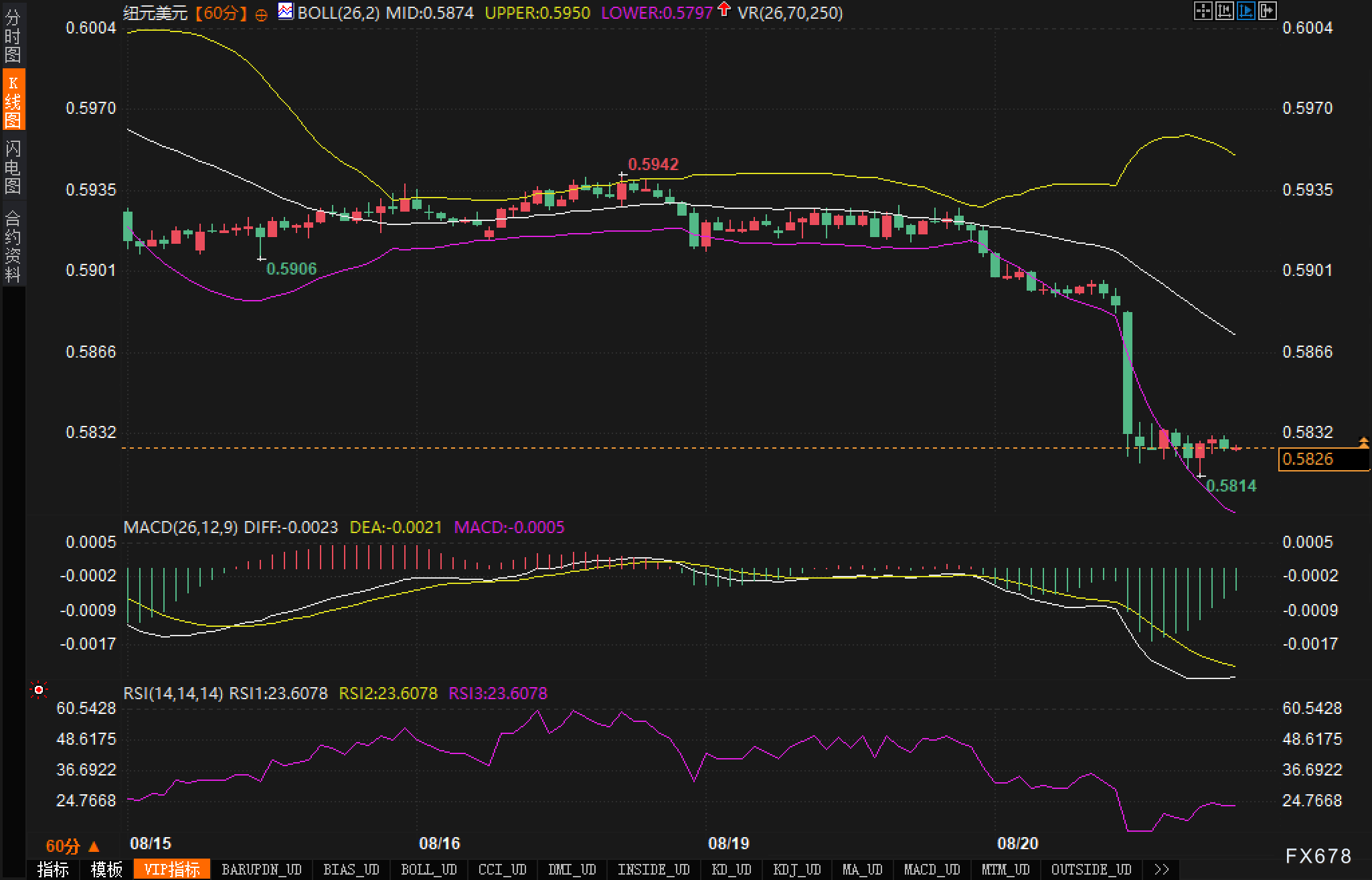 60分钟K线图显示,汇价在前期长时间窄幅整理后,出现单根长阴放量下破,形态上完成“箱体向下的有效突破”。当前布林中轨位于0.5874,上轨0.5950,下轨0.5797。价格自前期高点0.5942回落后,一举击穿中轨并沿着下轨急跌,最低探至0.5814,随后在0.5826一线弱势震荡,典型的“贴轨下行+短线技术性弱反抽”结构仍在延续。
