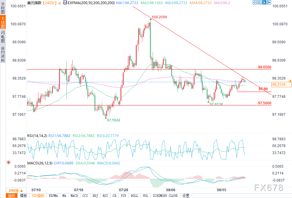 周三(8月20日)欧洲时段,美元指数(DXY)交投于98.30附近,价格变化不大,交易商在等待美联储主席鲍威尔本周晚些时候在杰克森霍尔年度研讨会上的讲话,以寻找货币政策路径的线索。