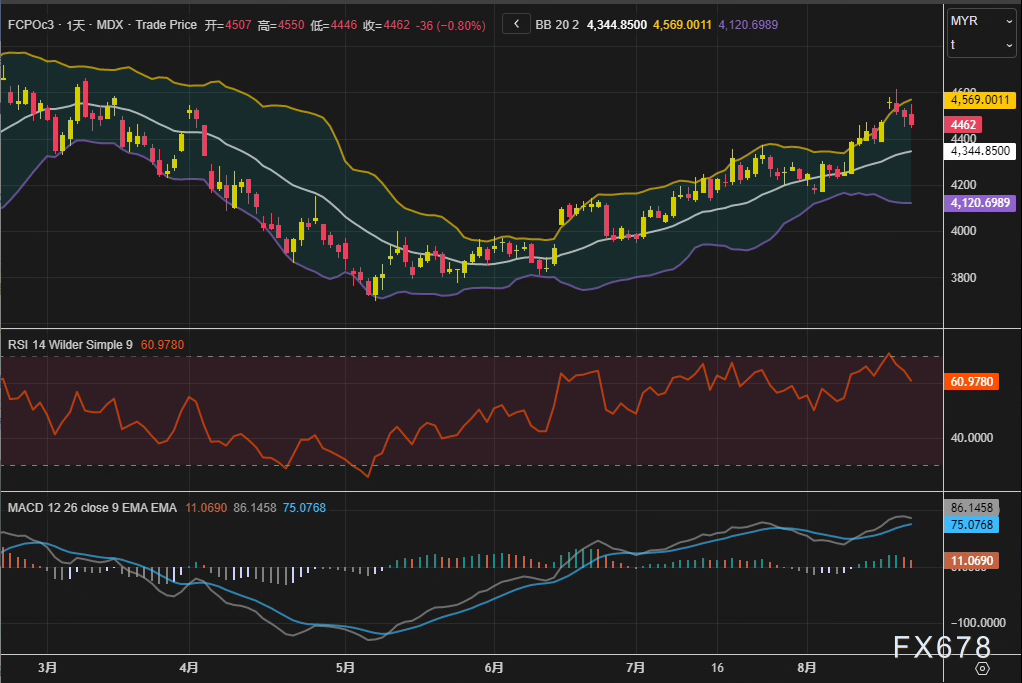 周四(8月21日),马来西亚衍生品交易所(BMD)棕榈油主力合约FCPOc3延续跌势,日内收报4462林吉特/吨,下跌36林吉特,跌幅0.8%。尽管8月1-20日出口数据强劲,但受中国大商所植物油期货疲软拖累,市场未能守住4500林吉特关键心理关口,午后抛压加剧。