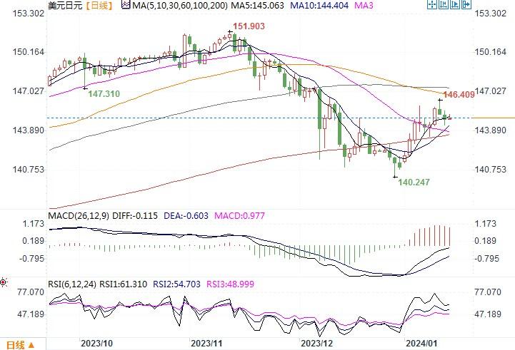 上周五(1月12日),美美元兑日元下跌0.29%,收盘于144.87,盘中最低一度至144.34。周五美国劳工部统计局称,12月最终需求生产者价格指数(PPI)环比下降0.1%。11月数据修正后为下降0.1%,前值为持平。PPI已连续三个月下降。生产者商品价格回落表明,尽管消费者商品价格在连续两个月下降后于12月回升,但商品通缩的势头依然没有改变。这推动交易员增加了对未来几个月降息的押注。根据芝商所(CME)的FedWatch工具,联邦基金利率期货市场目前预期3月降息的可能性为79%,高于周四预期的73%。美联储降息预期这么持续存在于市场中,无疑令日元走软的压力得以缓解。技术图形上观察,美元/日元似乎有可能已形成新顶部(处于146.00水平附近),目前汇价似乎在测试140.27至146.41涨势的38.2%斐波那契回档位144.06,若下破该位置,美元/日元将有可能进一步回落。上方若冲破146阻力,美元/日元本轮的升势或可得以延续。