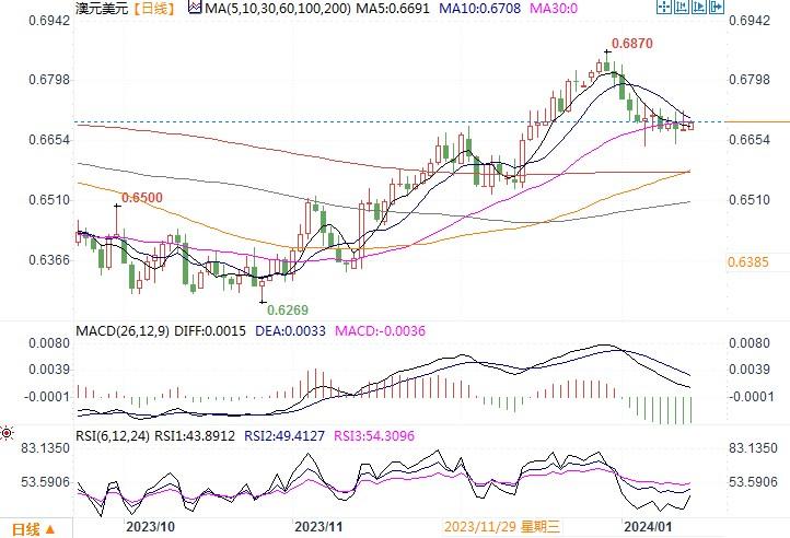 受周五(1月12日),澳元兑美元变化不大,收盘报0.6687。在美联储公布低于预期增长的PPI生产价格指数之后,FedWatch联邦观察工具预期3月降息的可能性从周四的73%上升为79%,而且当日美国短期公债收益率则大跌10个基点。于此同时,在欧洲央行总裁拉加德的鸽派言论强化了该央行最早将于4月降息的预期后,澳元兑欧元也短暂触及一个月高点。相对照的是,市场认为澳洲央行将更晚采取行动,利率期货暗示澳联储2024年全年降息幅度将为50个基点,而美联储为155个基点。未来利率走向的分化和差异,暂时给到了澳元一些支撑。然而,澳洲上周公布的澳洲11月消费者物价数据意外弱于预期,暗示第四季通胀率也将低于澳洲央行的预测。有著名机构为此体出分析意见认为澳洲央行今年下调利率的幅度可能会超过市场目前的预期。因此,澳元/美元似乎也未能产生更大的反弹动能。日线图上, 日线动量指标缓和,布林带区间持平,信号混杂没有明确倾向。久经考验的10月/12月上涨走势的38.2%回档位0.6641是关键支撑位,上周高点0.6734和随后的21日均线0.6753是重要阻力位。