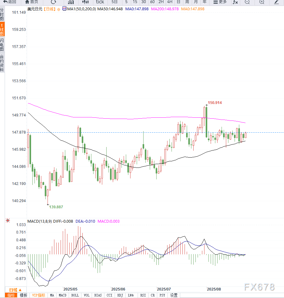 从日线走势来看,USD/JPY目前交投于147.60附近,整体仍处于高位震荡区间。价格运行在20日与50日均线上方,但短线动能趋弱,MACD红柱缩窄,显示上行动能减弱。