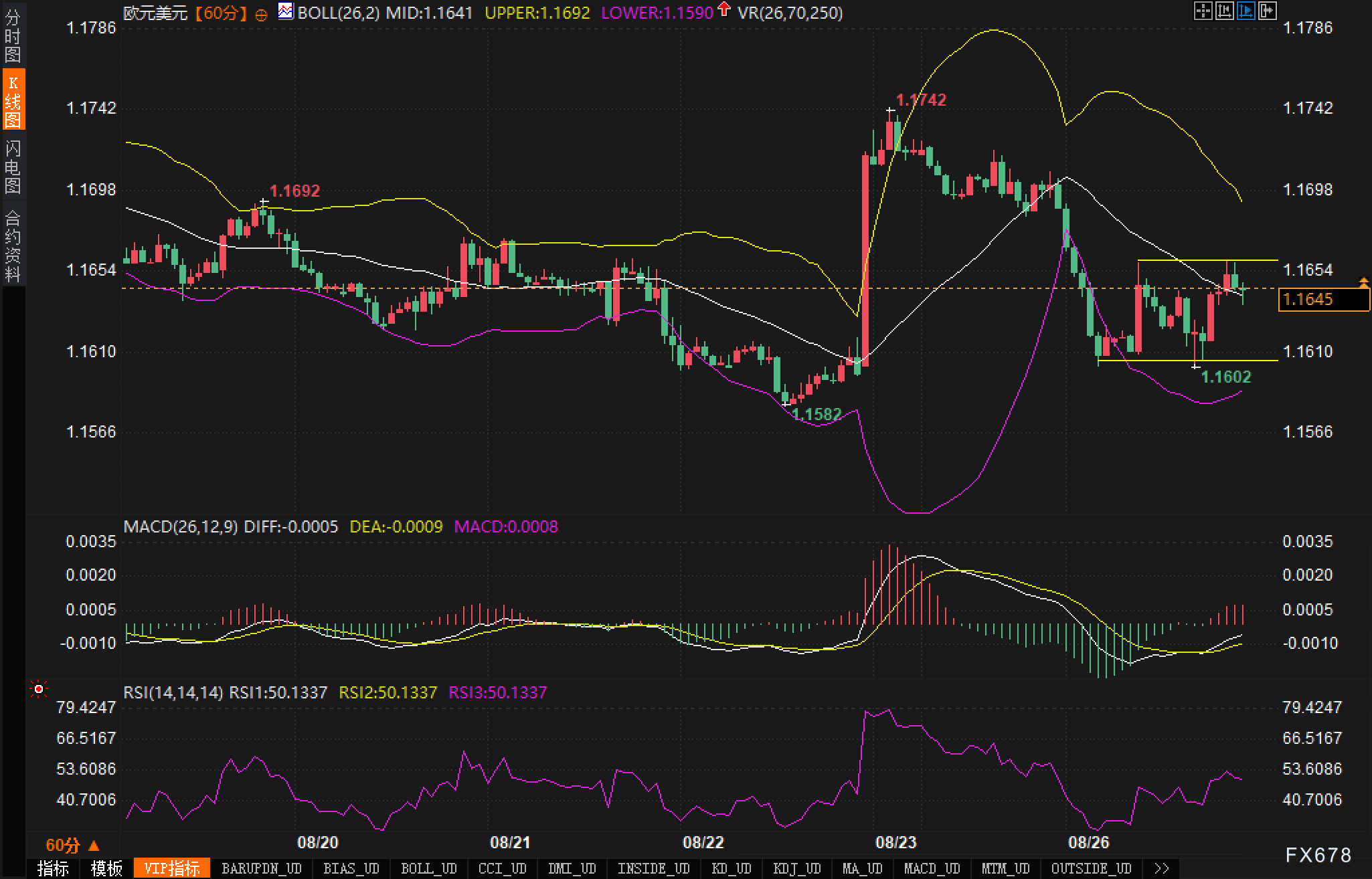 从小时图观测,布林中轨位于1.1641,布林上轨在1.1692,布林下轨在1.1590,当前价格附近1.1645,正处于中轨上下的小幅拉锯。前高1.1742与前低1.1582构成本轮波段的区间边界,8月26日盘中低点进一步下探至1.1602后出现反抽,右侧的黄色矩形清晰标示出1.1610—1.1654的箱体整理,属于典型的“震荡消化”形态。MACD此前经历零轴下方的扩散下行,柱状图转负后逐步收窄,最近两根红柱回升但DIFF与DEA仍贴近零轴,显示动量恢复尚需时间;若向上金叉并有效突破箱体上沿1.1654,才可能打开对布林上轨1.1692的回测窗口。