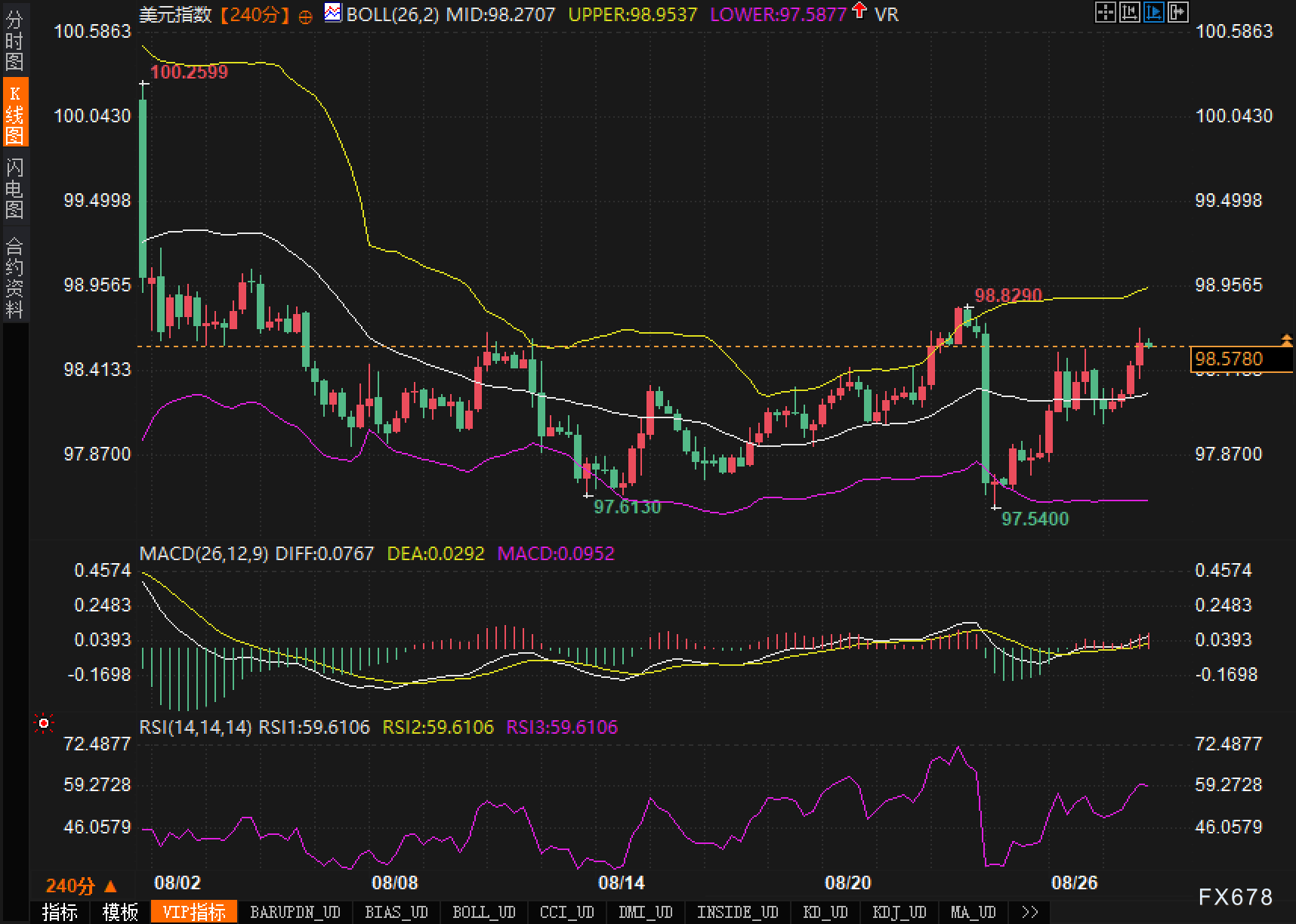 周三(8月27日)欧洲时段,美元指数(DXY)在消息驱动与数据空窗期交织下维持高位拉锯。盘面上,4小时图显示DXY最新围绕98.60一线震荡。
