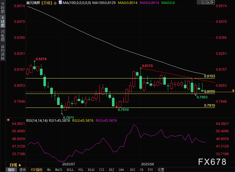 美元兑瑞郎周四(8月28日)欧市时段在0.8000心理关口附近获得支撑,现于0.8015附近窄幅震荡,此前该货币对连续三次均未冲破0.8075,而后从周三0.8075的高点回落,尽管周四公布的瑞士经济数据疲软,但短期看跌趋势仍未改变。