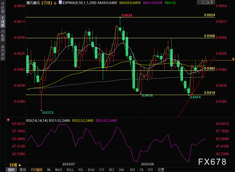 上行方面,澳元兑美元或将试探8月14日触及的月内高点0.6568区域,继而挑战7月24日创下的九个月高点0.6624。