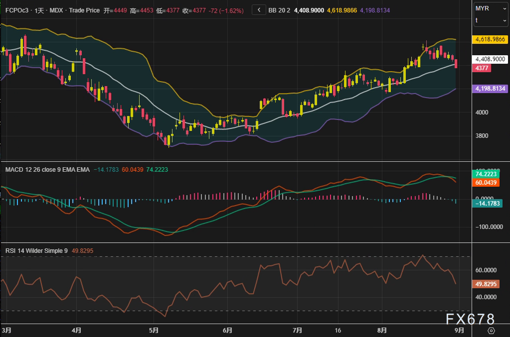 周五(8月29日),马来西亚衍生品交易所(Bursa Malaysia Derivatives Exchange)棕榈油主力合约FCPOc3收于4377林吉特/吨,单日下跌1.62%,周线累计跌幅达3.36%,终结了此前连续三周的上涨态势。盘中价格波动剧烈,技术指标显示RSI(14)已升至94.83,远超超买警戒线,而MACD柱状图呈现负值(-14.18),暗示短期动能转弱。