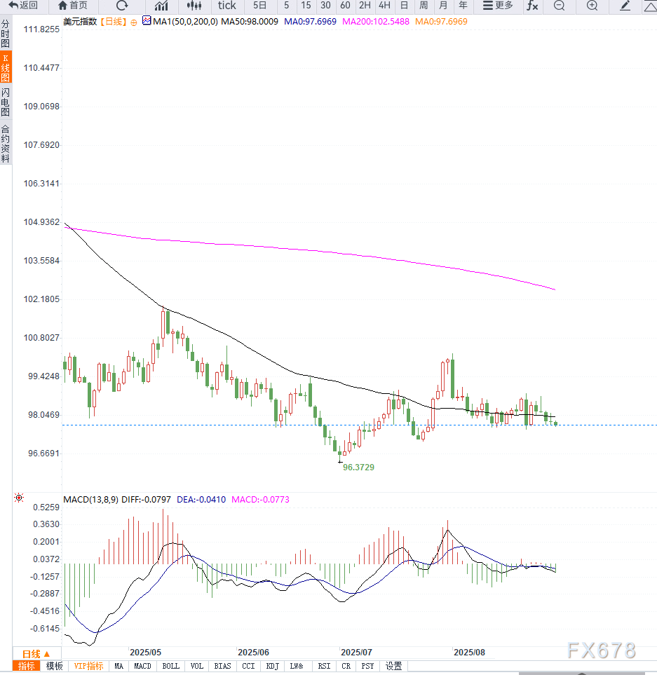 美元指数短期走势面临双重压力:一方面,美联储降息预期增强削弱了美元吸引力;另一方面,关税政策的不确定性仍加大市场波动。预计在9月议息会议前,美元或继续承压,并在97.50—98.20区间震荡。
