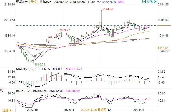 周一(1月15日)金价上涨0.2%,至每盎司2,052.10美元。中东紧张局势升级以及市场加大了对美联储最早将于3月降息的押注,使得黄金的投资吸引力逐步提升。但由于美国周一为马丁路德金纪念日假期,市场交投淡静,为此黄金波幅有限。