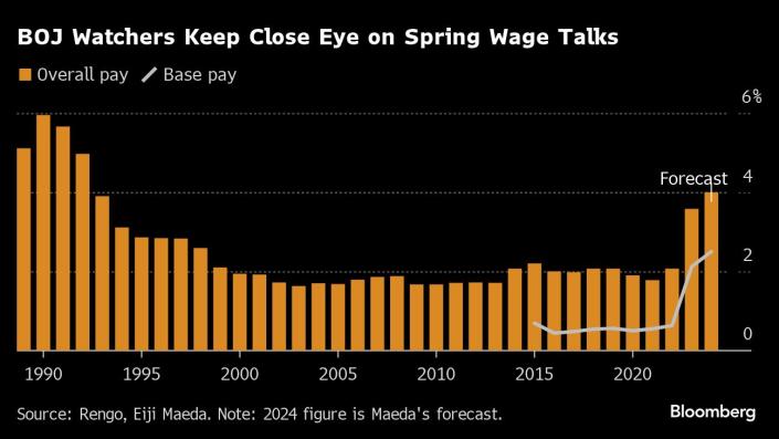 市场参与者正在密切关注年度工资谈判,因为这可能是促使日本央行结束全球最后一次负利率的决定性因素。这是大多数日本央行观察人士预测央行将等到 4月份才会自2007年以来首次加息的主要原因之一。