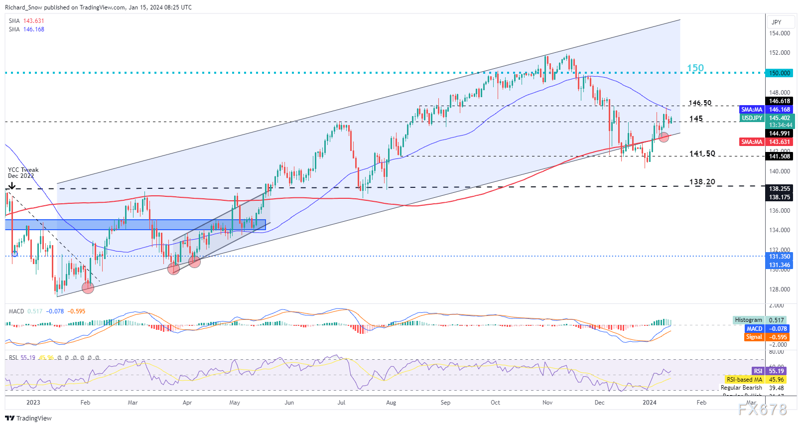 最近的CPI和工资增长数据缓和了要求日本央行退出负利率的呼声。周四,日本12月份的通胀数据将影响汇率下一步走势。趋势线和145作为主要支撑位置,150仍然是上涨的主要阻力位置,美元能否上涨仍不确定。