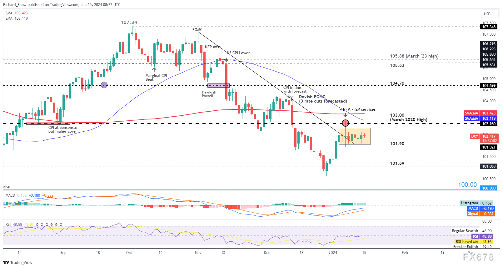 美元指数过去两周的大部分时间里都在区间内交易。103.00阻力位限制了美元的上行,200简单移动平均线和50简单移动平均线增强了阻力区的阻力。