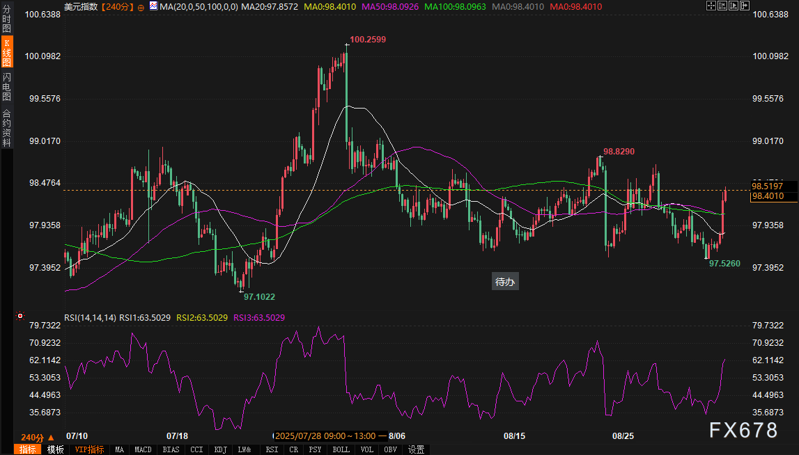 周二(9月2日),美国国会复会,距离9月30日这个财政拨款的最后期限已不足一月,政府关门风险升温。与此同时,美联储即将召开9月议息会议,市场普遍预期降息,但通胀与就业数据相互矛盾,使得决策面临两难。在这一背景下,美元指数显示出明显的上涨动能,技术面与基本面相互交织,为交易者提供了复杂的分析视角。