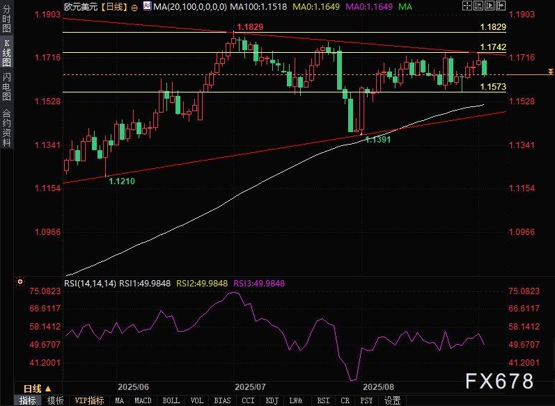 下行方面,近期低点1.1573构成初步支撑位,若跌破该支撑位,汇价可能持续下探至100日移动平均线(MA)(1.1518)和下行趋势线附近支撑区域。