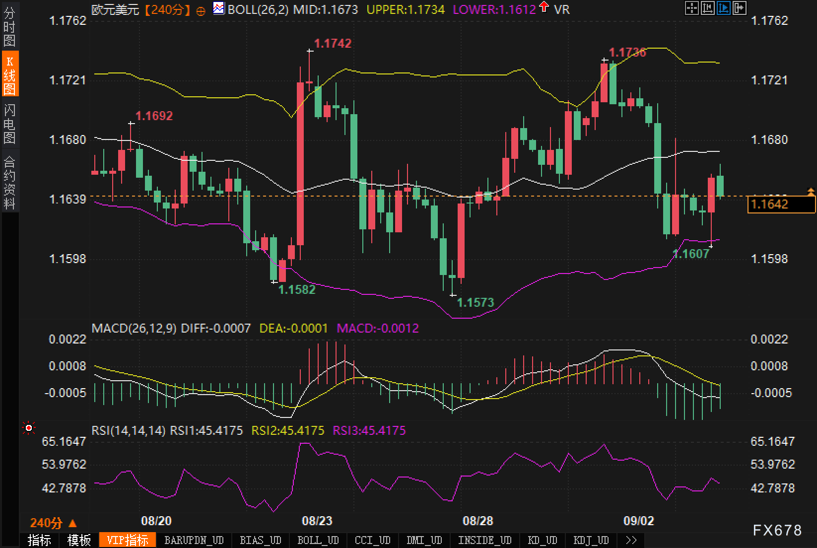 四小时K线显示,布林带中轨位于1.1673,上轨1.1734,下轨1.1612;最新价格在1.1640一带运行,依旧靠近下轨,说明短线处于“弱势震荡—均值下方”的状态。近期价格多次在下轨附近“贴带”运行,阶段低点依次为1.1582、1.1573与1.1607,显示下方买盘虽有承接,但力度并不统一;上方阶段高点1.1692、1.1742与1.1738构成密集阻力带,与上轨重合形成“压顶”。