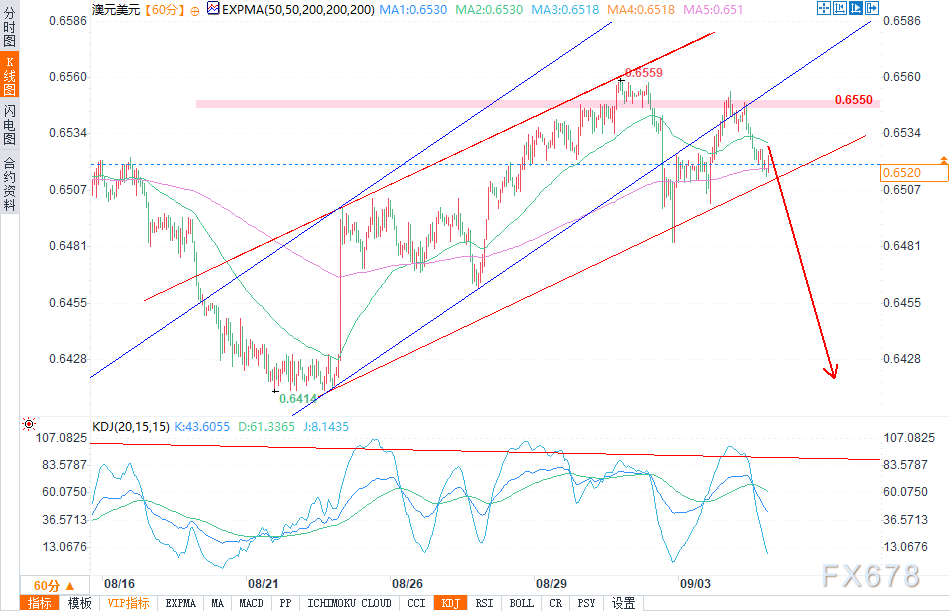 澳元/美元汇率在触及0.6550这一强劲阻力位后出现回落,并在看涨通道下轨下方企稳,这表明市场抛售压力有所加大。