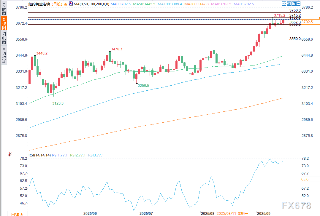 扎纳金属公司(Zaner Metals)副总裁兼高级金属策略师彼得·格兰特(Peter Grant)表示,“目前来看,降息25个基点的预期基本已成定局,”并补充称,年底前可能还会有一到两次降息。格兰特指出,黄金短期内的下一个上行目标是3700美元,随后是3730美元和3743美元。