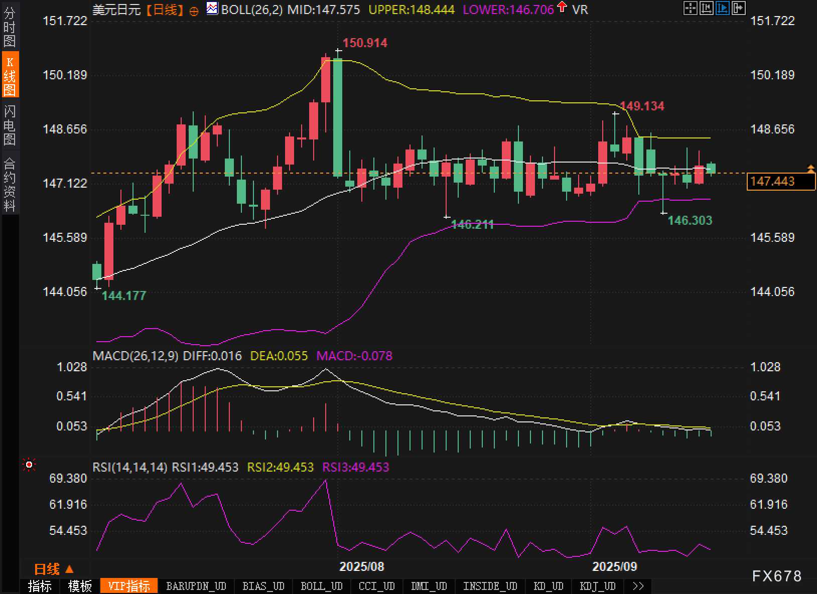 从日线图观察,布林中轨位于147.575,上轨148.444、下轨146.706,当前价格围绕147.40附近窄幅运行,K线实体偏短、影线频繁,典型横盘趋势与布林带挤压特征同时出现,显示波动率收缩后的方向性突破临近。上方首先关注中轨与上轨之间的密集成交区,一旦有效上破148.444并完成回测确认,则有机会指向前高149.134,进一步则是阶段峰值150.914。下方若失守146.706,则下探146.211/146.303的静态支撑带概率上升,若该带被量能突破,则不排除回补至更下方的144.177一带。