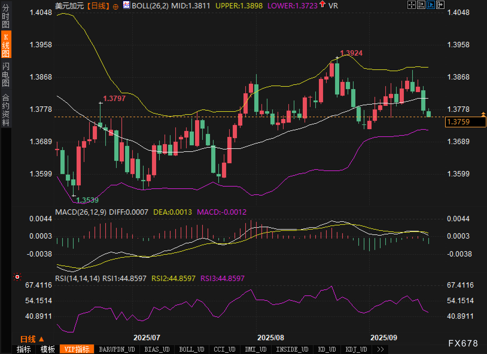 从日线图看,布林带呈温和收敛,中轨1.3811自8月中旬以来由升转平,表征趋势动能趋缓;上轨1.3898与下轨1.3723构成短线波动区间。当前K线实体位于1.3750附近,略低于中期均值。