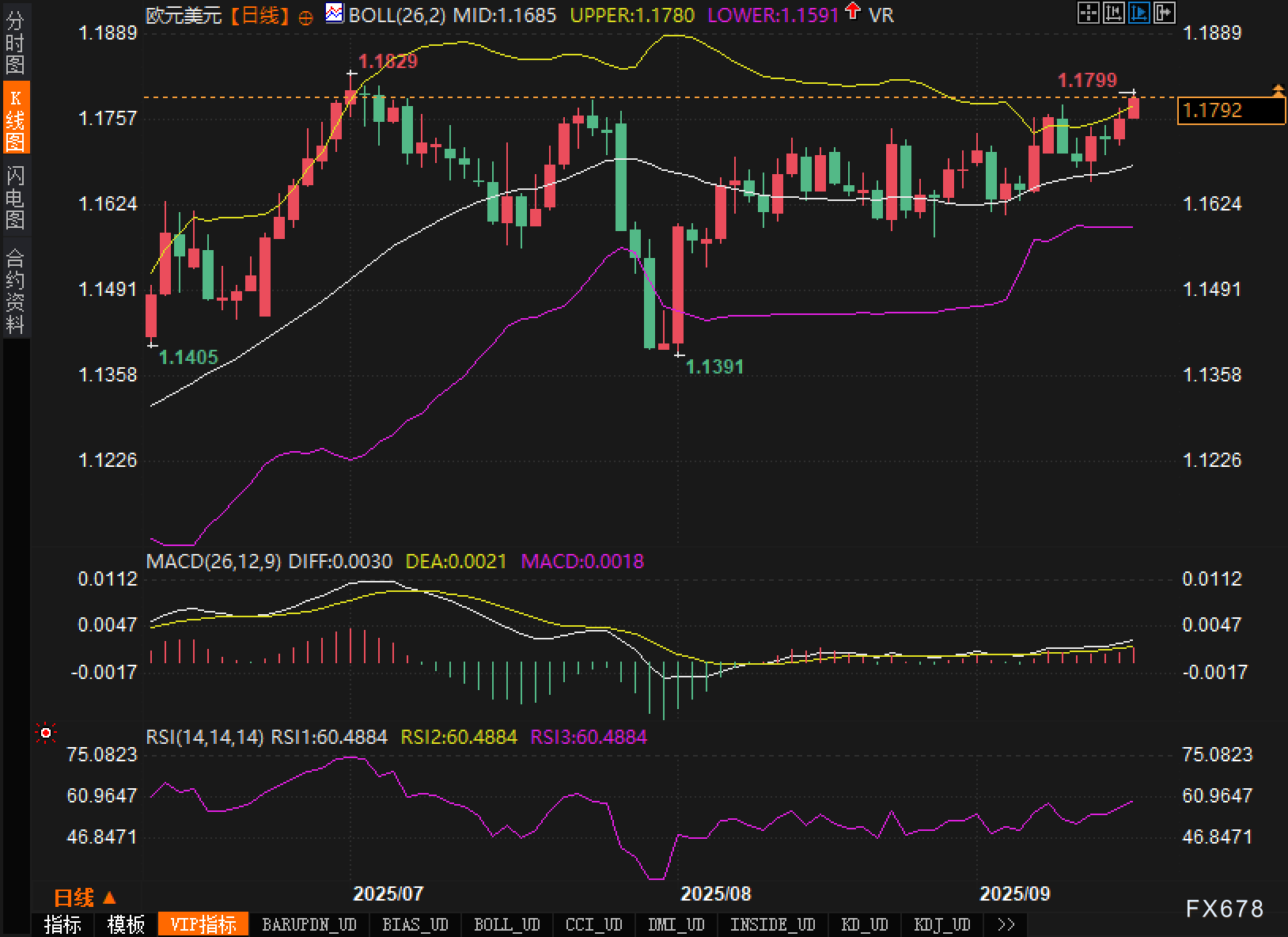日线图显示,布林带中轨1.1685,上轨1.1780,下轨1.1591。当前1.1792的价位已压在并略上穿上轨,若进一步突破,则将指向上方波段高点1.1829与1.1900的整数心理关口。蜡烛图近阶段呈上升通道内的推升结构,回撤多沿中轨附近获得动能修复。